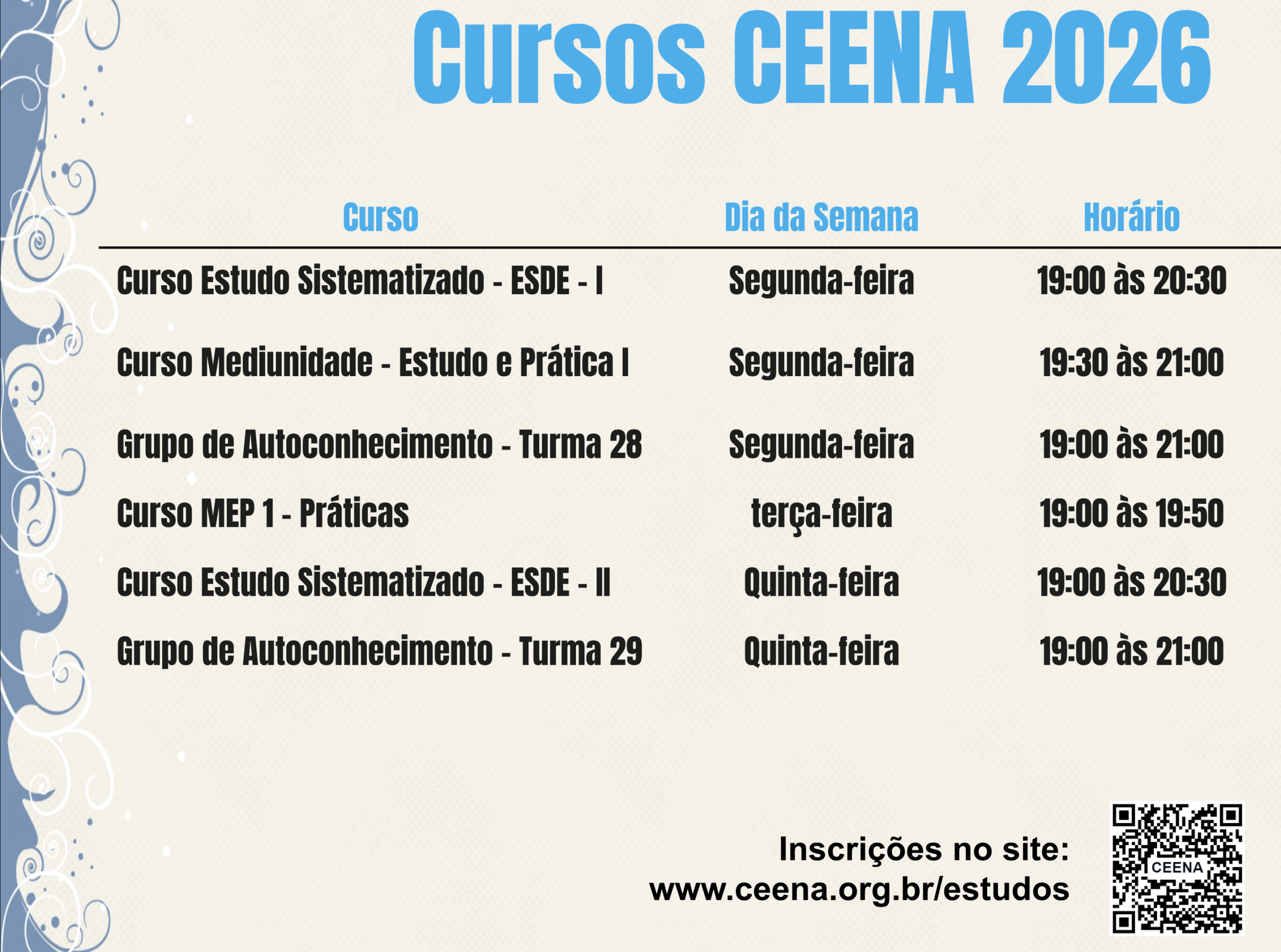 Estudo, Trabalho e Renovação Interior, estas são as bases fundamentais do processo iniciático realizado através dos Cursos da Doutrina dos Espíritos na CEENA e que entendemos deve se manter após conclusão dos mesmos.